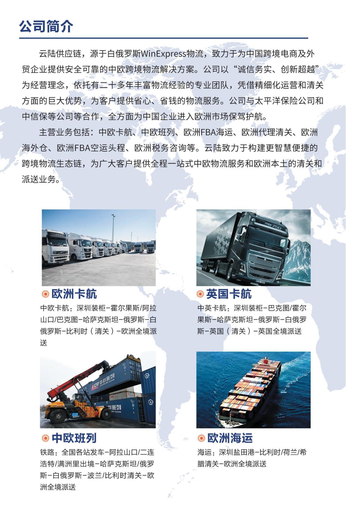 云陆供应链,源于白俄罗斯WinExpress物流,致力于为中国跨境电商及外贸企业提供安全可靠的中欧跨境物流解决方案。公司以“诚信务实、创新超越”为经营理念,依托有二十多年丰富物流经验的专业团队,凭借精细化运营和清关方面的巨大优势,为客户提供省心、省钱的物流服务。公司与太平洋保险公司及中信保等公司合作,全方面为中国企业进入欧洲市场保驾护航。 主营业务包括:中欧卡航、中欧班列、欧洲FBA海运、欧洲代理清关、欧洲海外仓、欧洲FBA空运头程、欧洲税务咨询等。 云陆致力于构建更智慧便捷的跨境物流生态链,为广大客户提供全程一站式中欧物流服务和欧洲本土的清关派送服务。