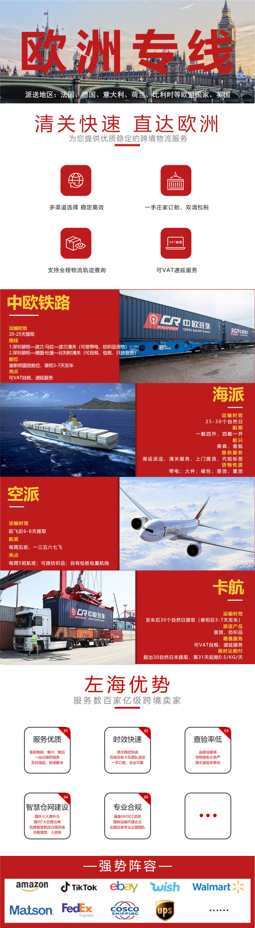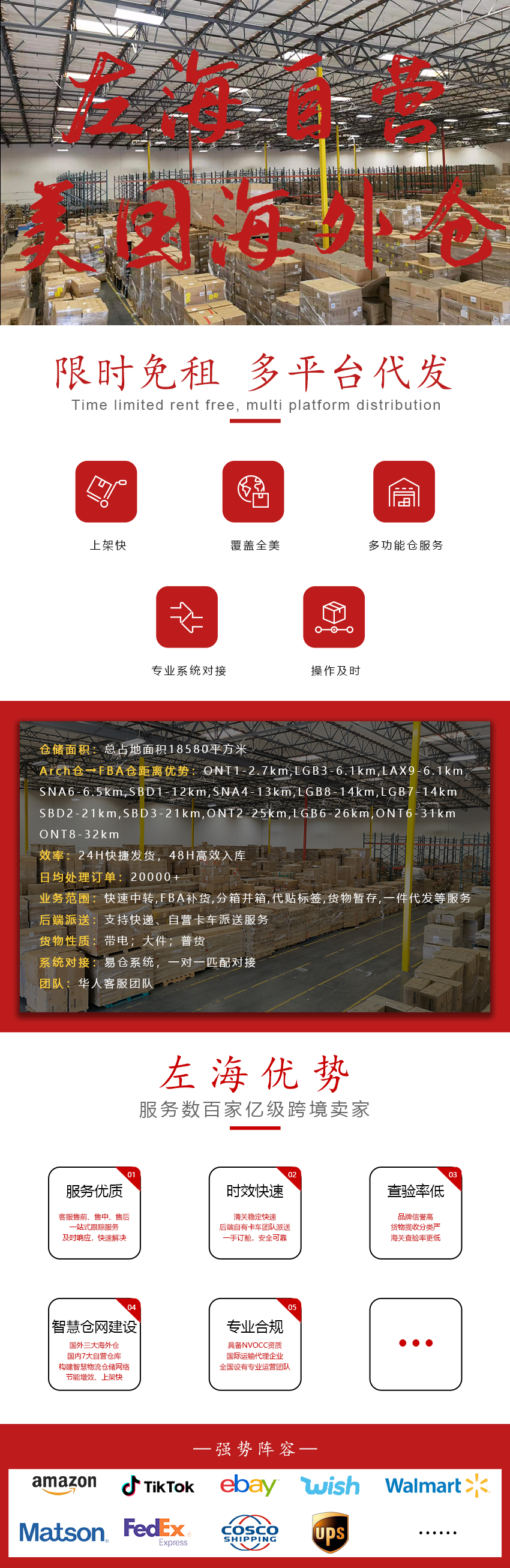 左海国际物流有限公司(以下简称左海物流)创建于2017年,是经国家商务部批准的专业国际物流公司,在深圳、广州、厦门、泉州、莆田、福州、宁波等地设立分公司。公司专注于全球跨境电商全链条物流服务,主要为亚马逊、沃尔玛、Tiktok、Wish、eBay、速卖通、独立站等跨境电商卖家提供安全稳定、高效便捷的海运、空运、铁路、卡航、海外仓储、通关清关、集运等一站式跨境物流解决方案,并不断在供应链管理、智慧物流管理、综合物流项目等领域深耕开发与实践,发展多元化智慧物流。 全球经济,物通人达。左海物流自主打造了多条高质、稳定的跨境物流优势渠道,包含FBA头程、美国专线、加拿大专线、欧洲专线、墨西哥专线等;拥有专业的操作团队、清关团队、客服团队,提供横跨全球的专业服务;与世界多个国家和地区的船司、航空公司达成深度战略合作,稳步构建完善的物流网络,畅通国内国际双循环;拥有4万㎡自营仓库,搭建了智慧物流与仓储管理系统,利用先进技术把控成本,为客户提供安全可控、高性价比的国际物流解决方案,同时不断优化方案,真正为客户做到降本增效。