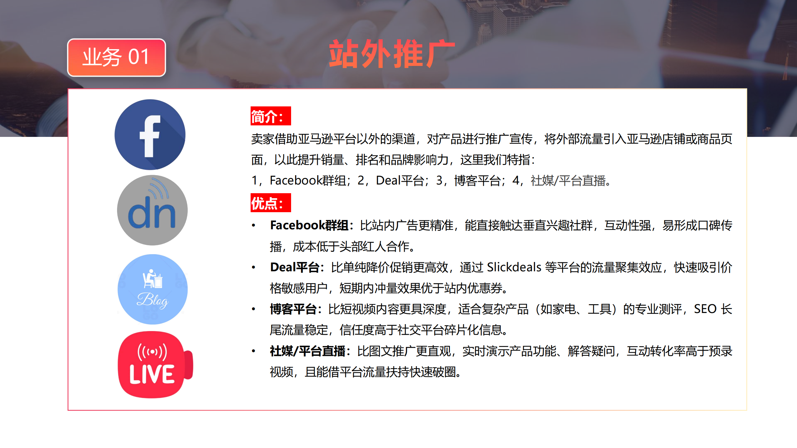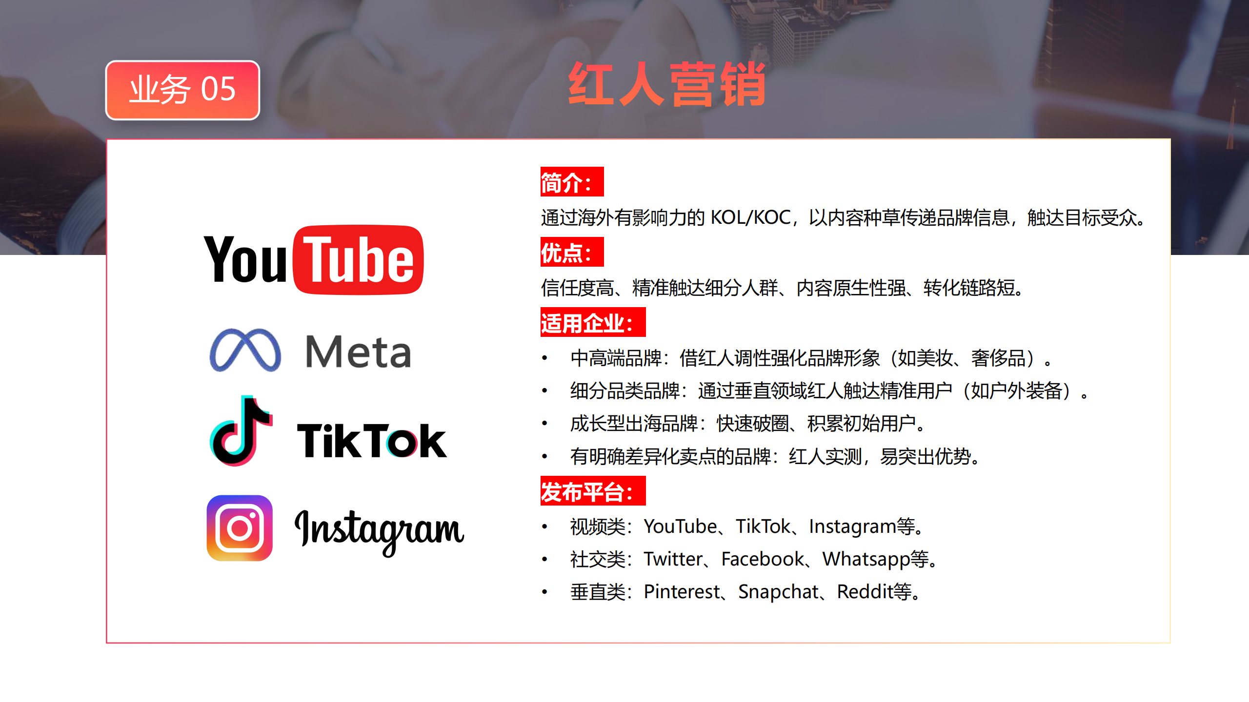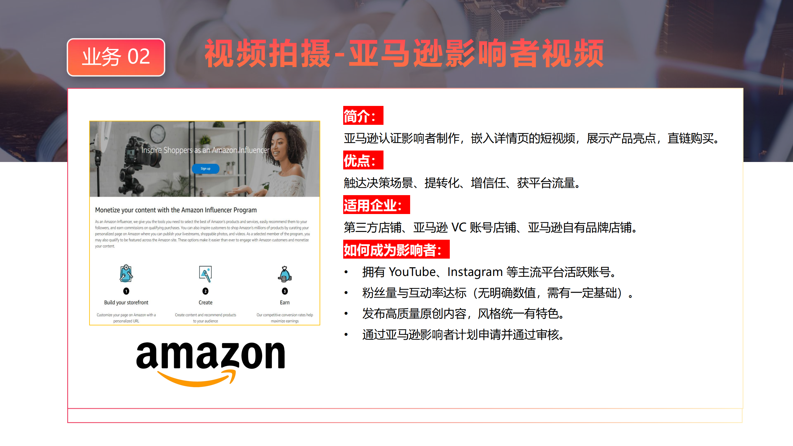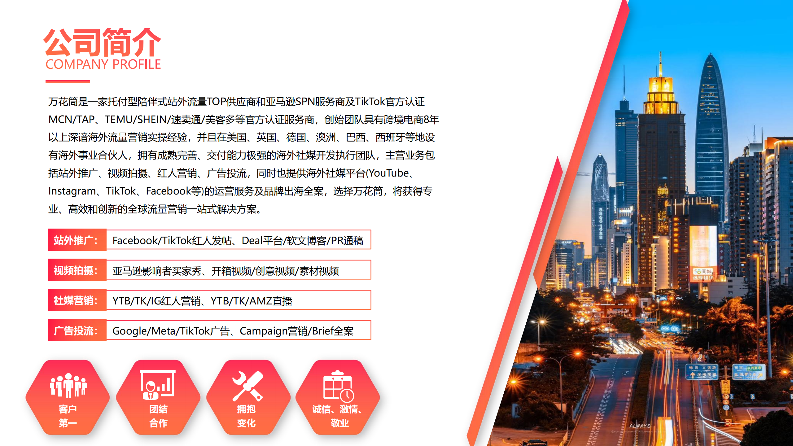 万花筒跨境是一家平台卖家和品牌商家托付型陪伴式服务商,专注于: 站外推广:Facebook&TikTok群组/红人发帖、Deal平台、软文博客、PR通稿 视频拍摄:亚马逊影响者买家秀、开箱视频、素材视频、企宣/品宣视频 红人营销:YouTube/TikTok/Instagram 红人营销、Amazon/Youtube/TikTok直播 广告投流:Meta/TikTok/Google广告、Campaign营销、Brief 全案 提供多元、高效、高转化的海外营销解决方案,帮助卖家快速获取大量海外精准流量,转化更多订单!