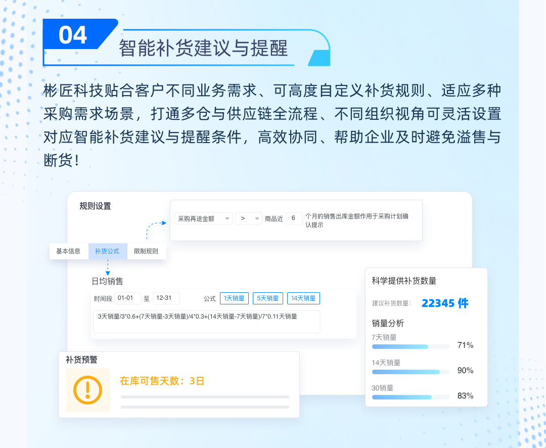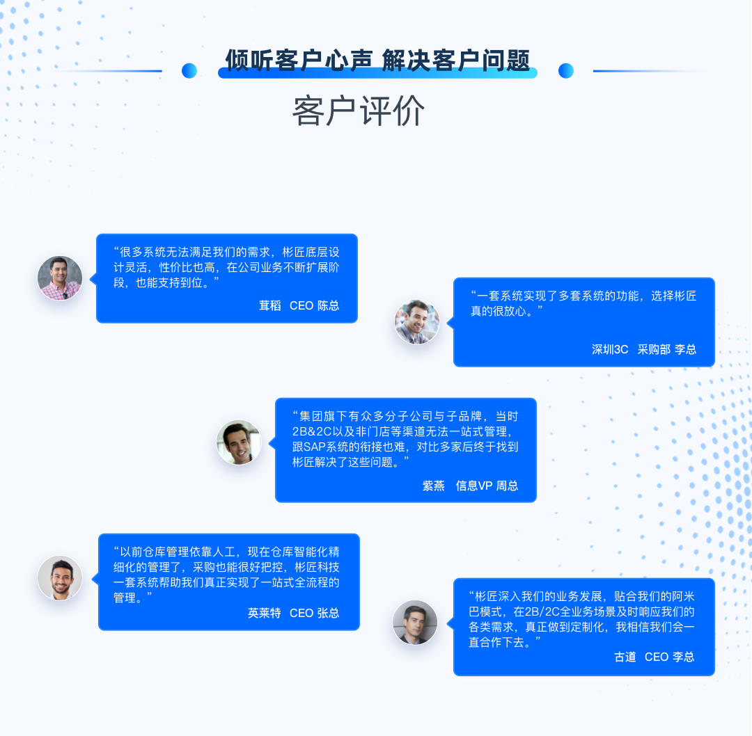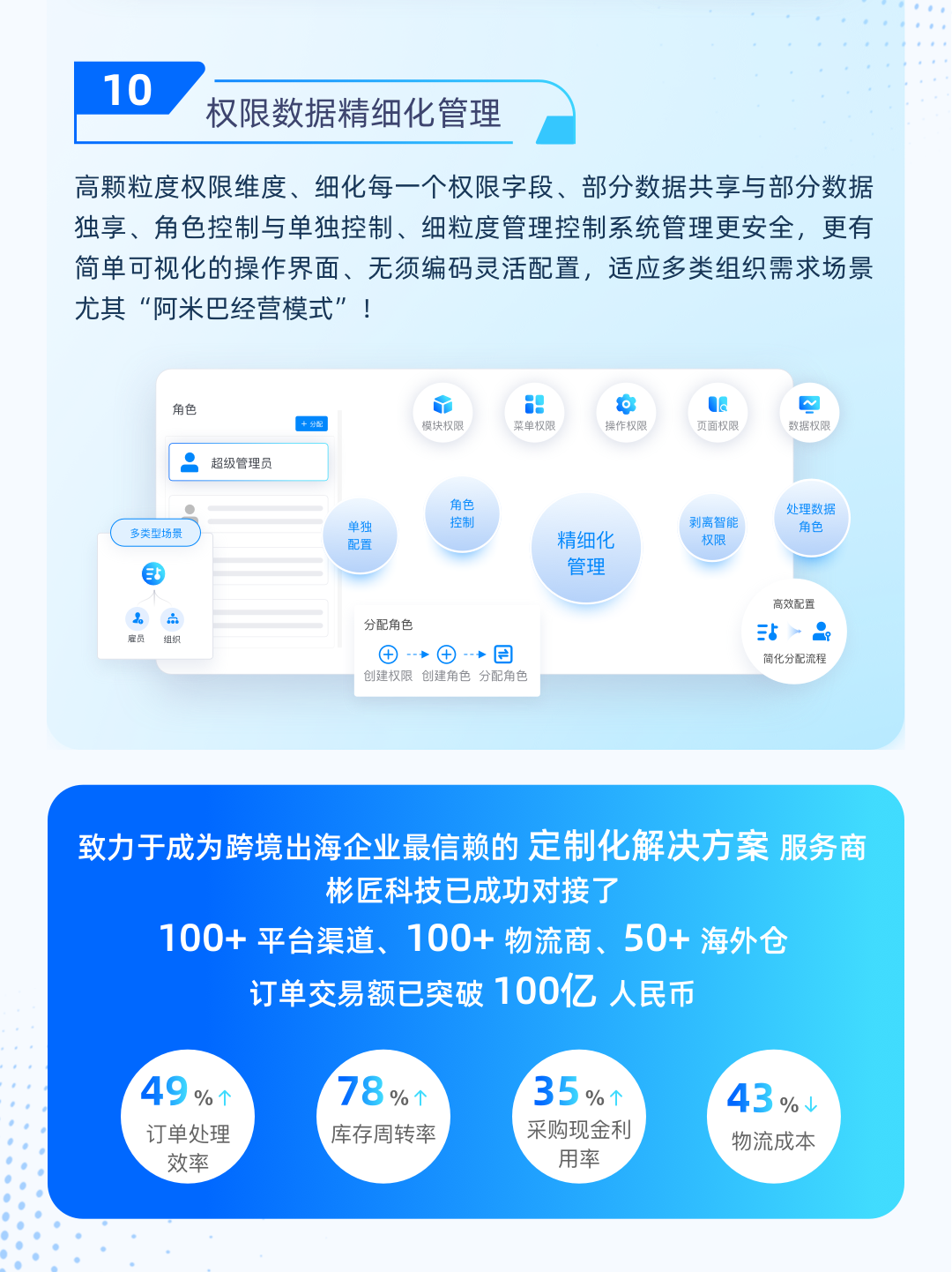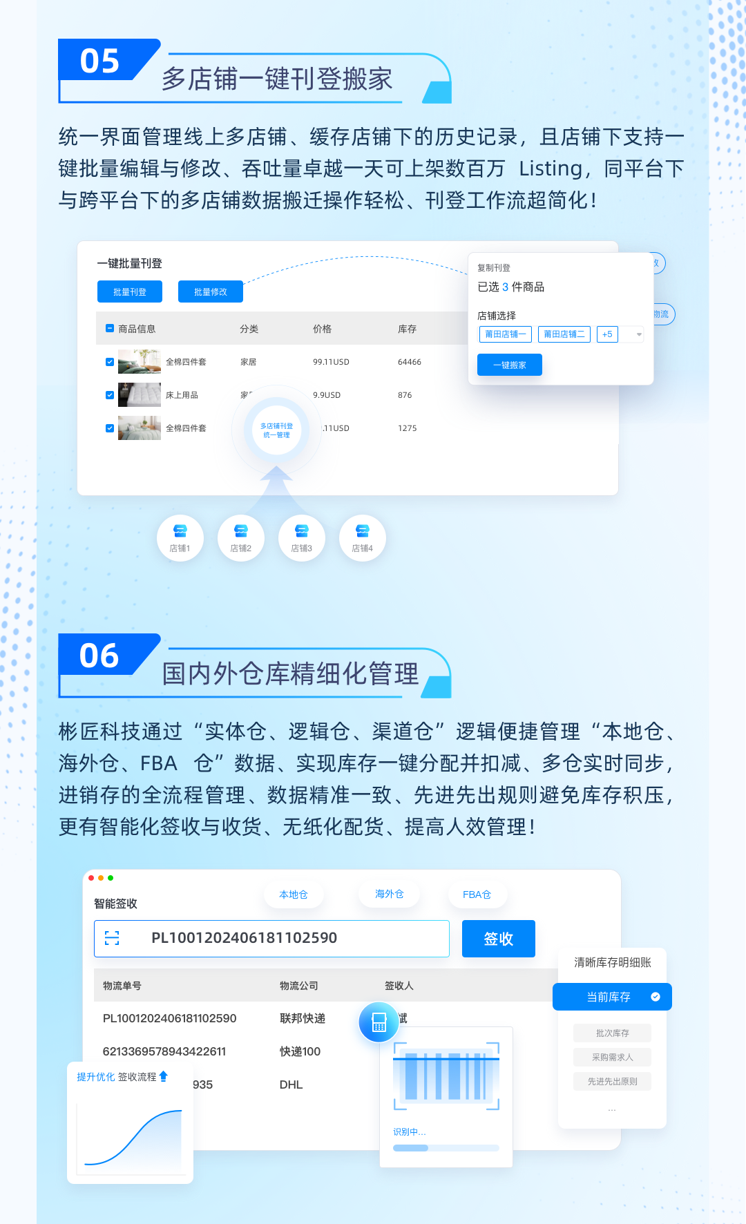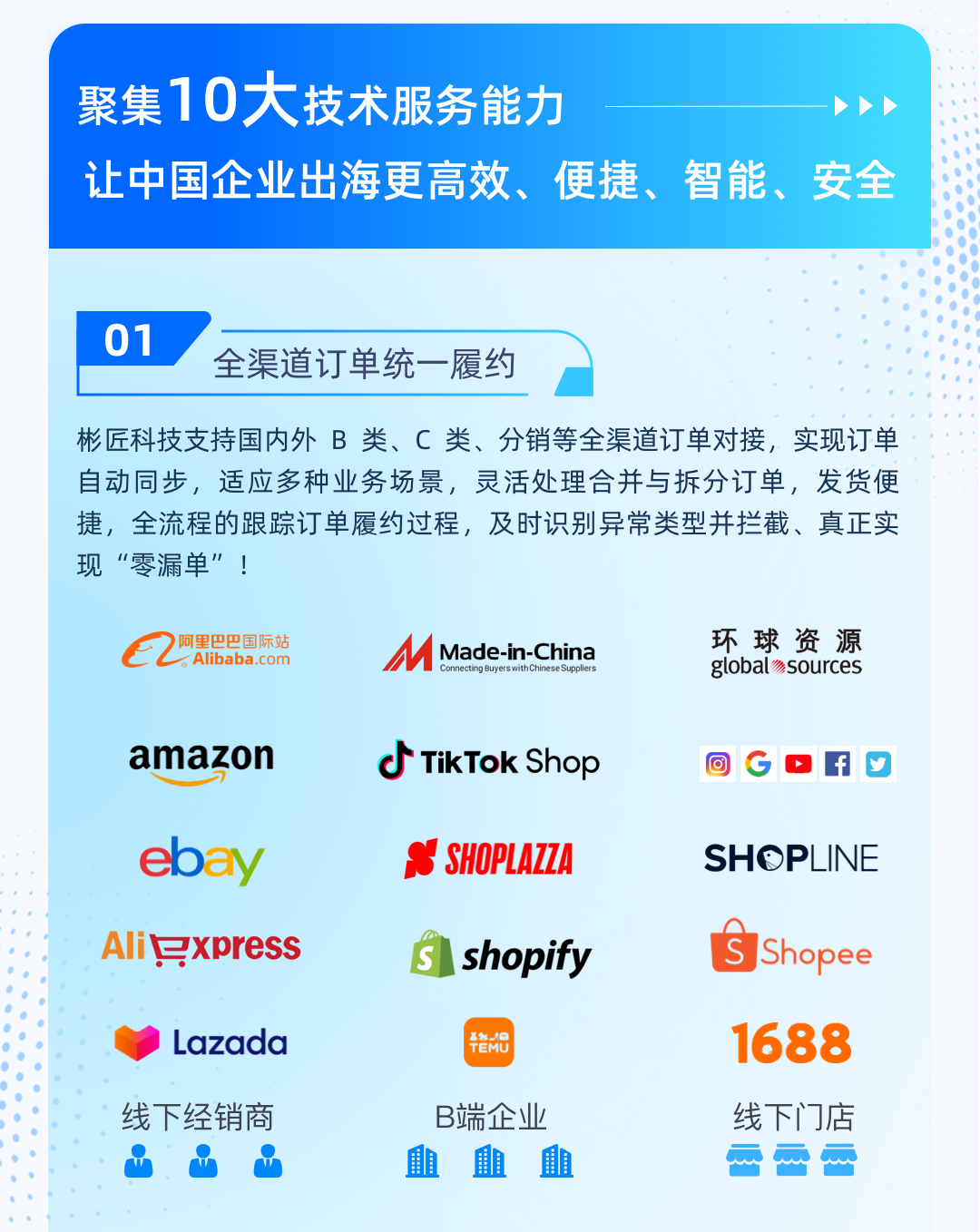 上海彬匠信息科技有限公司(简称:彬匠),致力于成为跨境出海企业最信赖的定制化解决方案服务商。 其自主研发产品「彬匠 ERP」亦称「彬匠中台」 ,聚焦于为规模性客户赋能其全球业务,产品定位于全场景、一站式、业财一体化的解决方案,实现从选品、采购、上架,到仓储管理、物流跟踪、订单履约、售后,再到财务核算与对账的全流程管理。 截至目前,彬匠 ERP 已与多家渠道商(国内/外电商平台、线下渠道)、物流商、海外仓、支付商成功对接,年均处理订单交易额已突破100亿人民币。未来,彬匠科技将持续为中国品牌走向全世界深度赋能!