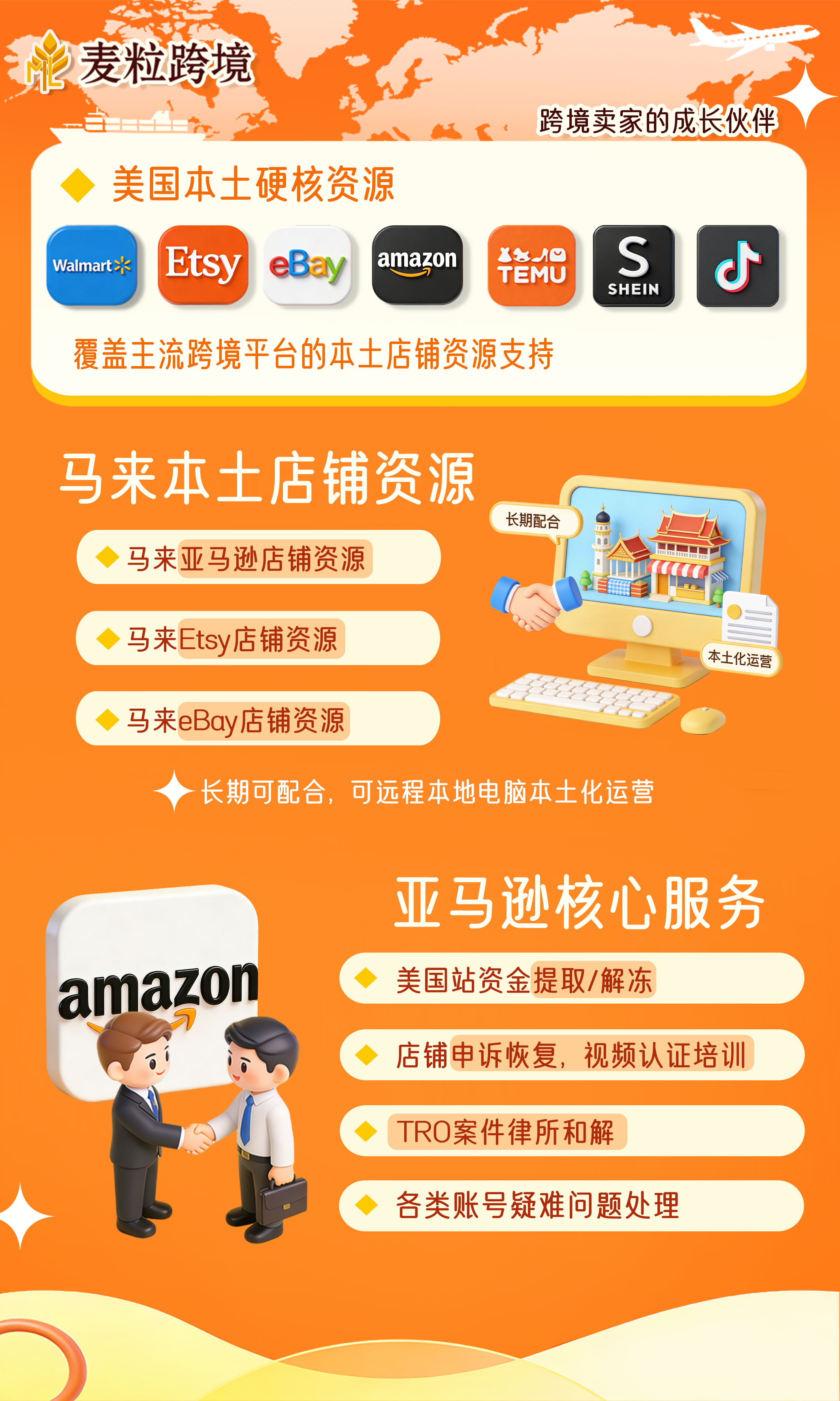 ◆麦粒跨境——致力于解决跨境卖家99%的问题! ◆我们注于为跨境卖家提供一站式服务: 【1】协助亚马逊、ETSY、TEMU、TK等主要跨境平台开店(可提供美国/马来西亚本本店铺资源); 【2】提供ETSY从0-1陪跑服务(线下+线上模式陪跑,打造属于您的明星店铺); 【3】提供美国强开资金服务,成功率高达99%; 【4】提供店铺申诉、资金申诉、视频培训、链接下架申诉、TRO资金解冻等专业服务; 【5】帮助客户解决各类审核问题:美国二审、资质审核、欧洲KYC审核、消费者法案、店铺被锁等; 【6】其他各类疑难杂症:内部查询和店铺体检代报BD/LD、上A+、上360环视图、赶跟卖、真人测评、店铺保险、现成R标/BG标、开通handmade、美国商标换律师、美国锁仓、BG2.0授权、白名单、代备案、翻新、红人视频、美国清库存、海外仓一件代发/移仓换标等,全面满足客户的多元化需求。 ★ 如果您遇到任何跨境相关问题,欢迎免费咨询,联系我们对接更多跨境资源!