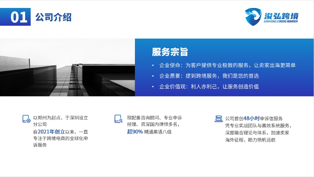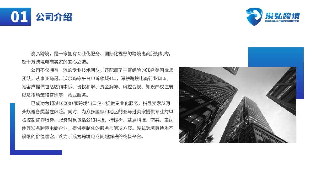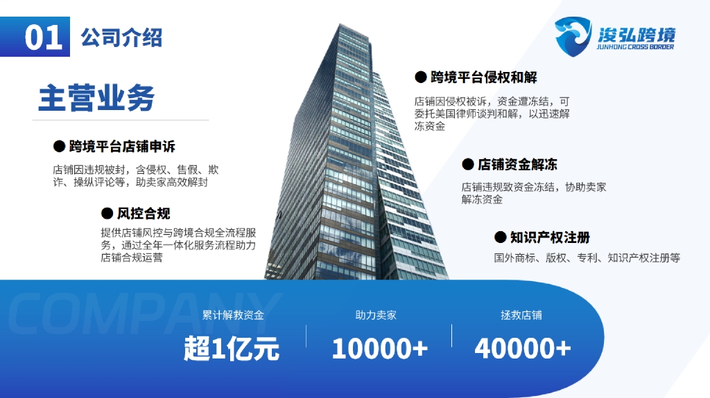 浚弘跨境,是一家拥有专业化服务、国际化视野的跨境电商服务机构超十万跨境电商卖家的安心之选。 公司不仅拥有一流的专业技术团队,还配置了丰富经验的知名美国律师团队,从事亚马逊、沃尔玛等平台申诉领域4年,深耕跨境电商行业知识。为客户提供包括店铺申诉、侵权和解、资金解冻、风控合规、知识产权注册以及市场策略咨询等一站式服务。 已成功为超过10000+家跨境出口企业提供专业化服务,指导卖家从源头规避各类潜在风险。同时,为众多国家和地区的亚马逊卖家提供专业的风险控制咨询服务,服务对象包括公狼科技、柠檬树、蓝思科技、南棠、宝视佳等知名跨境电商企业,提供定制化的服务与解决方案。浚弘跨境秉持永不设限的价值理念,致力于成为跨境电商问题解决的终极平台。