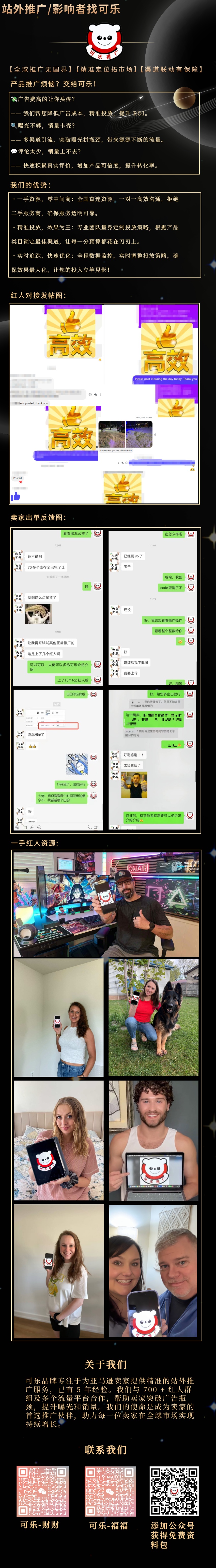 可乐品牌专注于为亚马逊卖家提供精准的站外推广服务,已有5年经验。我们与700+红人群组及多个流量平台合作,帮助卖家突破广告瓶颈,提升曝光和销量。我们的使命是成为卖家的首选推广伙伴,助力每一位卖家在全球市场实现持续增长。