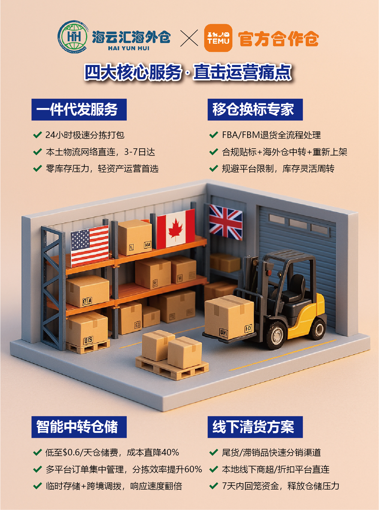 深圳市海云汇国际供应链有限公司,秉承专业、优质、诚信、高效的服务理念,专注跨境电商海外仓储服务,提供高效可靠服务,赢得客户信任。逐步拓展至欧洲、北美等地,扩大全球业务版图,为客户提供海外仓等全方位一站式仓储物流解决方案。引进智能仓储系统,完善的人员配置,提升物流效率,节约成本,为客户提供优质服务。建立覆盖全球海外仓网络,以客户至上的经营理念,为客户提供周密专业的仓储方案。让顾客放心,安心,省心!