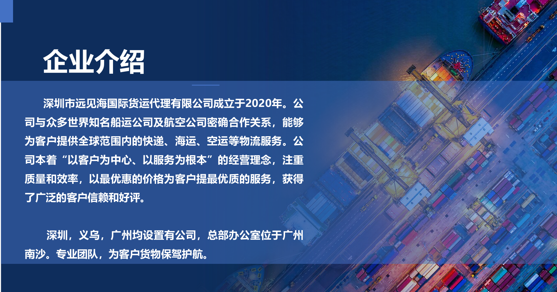 深圳市远见海国际货运代理有限公司成立于2020年。公司与众多世界知名船运公司及航空公司密确合作关系,能够为客户提供全球范围内的快递、海运、空运等物流服务。公司本着“以客户为中心、以服务为根本”的经营理念,注重质量和效率,以最优惠的价格为客户提最优质的服务,获得了广泛的客户信赖和好评。 深圳,义乌,广州均设置有公司,总部办公室位于广州南沙。专业团队,为客户货物保驾护航